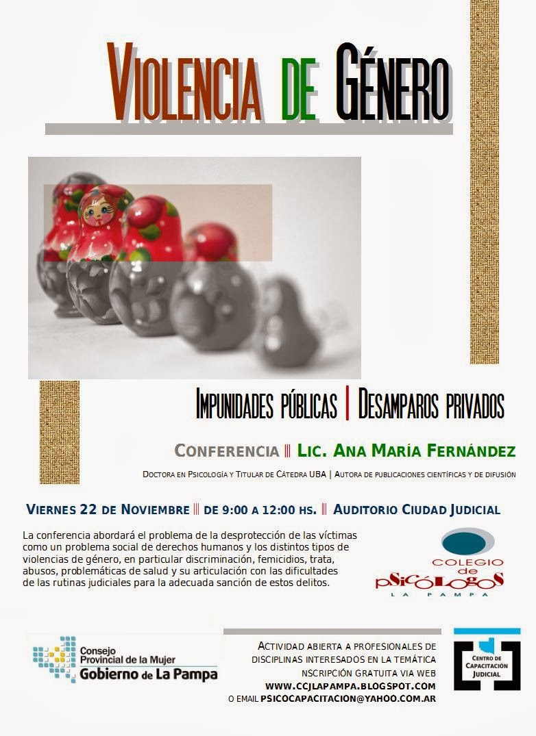 La conferencia de la Lic. Ana María Fernández sobre "Las Violencias de Género" se desarrollará el viernes 22 de noviembre desde las 9.00 hs. en el Auditorio de la Ciudad Judicial Santa Rosa, actividad coorganizada por el CCJ junto con el Colegio de Psicólogos y el Consejo Provincial de la Mujer de la Provincia de La Pampa. Los interesados pueden recabar más información y gestionar su inscripción gratuita a través de este enlace.