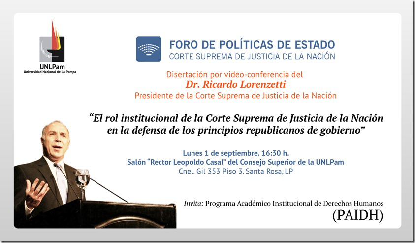 La transmisión será en el Salón del Consejo Superior de la UNLPam (Cnel Gil 353, tercer piso, Santa Rosa), y versará sobre "El rol institucional de la Corte Suprema de Justicia de la Nación en la defensa de los principios republicanos de gobierno".